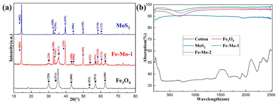 (a) XRD peaks of Fe3O4, MoS2, and Fe-Mo-1. (b) Optical absorption spectra of cotton, Fe3O4, MoS2, Fe-Mo-1, and Fe-Mo-2.