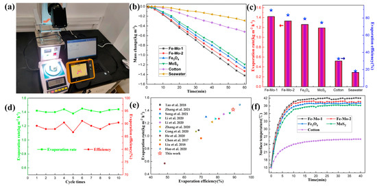 The physical picture of the SSG test device in the laboratory is shown in Figure 3a. The evaporation performance of Fe-Mo-1, Fe-Mo-2, Fe3O4, MoS2, cotton, and seawater samples was tested, and the evaporation performance of all samples was analyzed and compared. The test results are shown in Figure 3b. It can be clearly seen from the figure that, under one sun irradiation, after one hour’s test, the mass change of pure seawater and cotton is less, which is 0.29 kg m−2 and 0.52 kg m−2, respectively. When Fe3O4 and MoS2 samples are used for the tests, the mass change is increased to a certain extent; they are 1.26 kg m−2 and 1.19 kg m−2, respectively. The mass change of Fe-Mo-1 and Fe-Mo-2 is greater than that of pure Fe3O4 and pure MoS2, which are 1.42 kg m−2 and 1.33 kg m−2, respectively. According to the calculation method described in Formula (1), the evaporation rates of several samples can be obtained in descending order as follows: Fe-Mo-1 (1.42 kg m−2 h−1), Fe-Mo-2 (1.33 kg m−2 h−1), Fe3O4 (1.26 kg m−2 h−1), MoS2 (1.19 kg m−2 h−1), cotton (0.52 kg m−2 h−1), and seawater (0.29 kg m−2 h−1). Furthermore, according to Formula (2), the evaporation efficiency of four samples can be calculated as follows: Fe-Mo-1 (89.18%), Fe-Mo-2 (83.52%), Fe3O4 (79.13%), MoS2 (74.73%), cotton (32.66%) and seawater (18.21%) (Figure 3c). To verify the stability of the photothermal conversion performance of the prepared Fe-Mo-1 sample, 10 cyclic tests were performed under the condition that the external conditions remained unchanged, as shown in Figure 3d. The average evaporation rate and evaporation efficiency of the 10 experiments were respectively obtained as 1.418 kg m−2 h−1 and 89.1%. It can be seen that the photothermal conversion performance of the sample is relatively stable. On the basis of the above data, it can be seen that the Fe3O4@MoS2 produced in this work has better water evaporation performance than pure Fe3O4 and pure MoS2, and higher photothermal conversion performance under the same irradiation intensity. Figure 3e shows the comparison of the evaporation efficiency and evaporation rate of this work with different literature under one sun irradiation. It can be seen that this work is better than most reported studies [8,12,19,24,27,28,29,30,31,32,33].