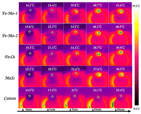 In order to measure the trend of surface temperature variation of different samples under one sun irradiation, the photothermal conversion performance of the samples was reflected. In the evaporation experiment of different samples, the infrared radiation imager is used to record the temperature changes on the surface of the samples, and the curve of the changes is shown in Figure 3f. In the figure, the temperature of the cotton surface is the slowest and the surface temperature of the other four samples rises faster. In the first five minutes, the surface temperature of Fe-Mo-1, Fe-Mo-2, Fe3O4, MoS2, and cotton increased by 19.6 °C, 19.1 °C, 18.9 °C, 17.4 °C, and 7.1 °C, respectively. The first three samples have the highest temperature increase, including Fe3O4, which shows that Fe3O4 has good photothermal conversion performance. The temperature of all samples began to rise relatively slowly between 5 min and 10 min. The temperature of the first four samples increased by about 5 °C on average, while the temperature of cotton rose less, by about 2 °C. After 10 min, the surface temperature of all samples began to become stable. When the temperature of the sample surface is stable, it can be found that the surface temperature of the Fe-Mo-1 sample is higher than that of Fe-Mo-2, Fe3O4, MoS2, and cotton by 1.4 °C, 2 °C, 2.8 °C, and 15.9 °C, respectively [34]. Figure 4 shows the infrared imaging of five different samples under one sun radiation for 0 min, 1 min, 5 min, 10 min, and 20 min. The above data confirmed the good photothermal conversion performance of Fe-Mo-1.