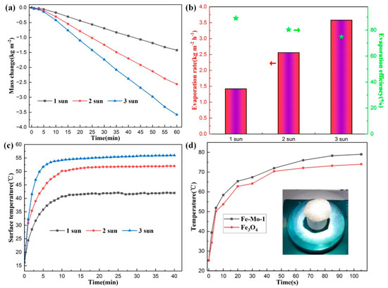 Figure 5a shows the curves of seawater mass changes in 60 min under 1, 2, and 3 sun irradiations using the Fe-Mo-1 sample. It can be seen from the figure that the greater the light intensity, the greater the loss of seawater quality. Under 1, 2, and 3 sun irradiation, the mass change for 60 min is 1.42 kg m−2, 2.56 kg m−2, and 3.58 kg m−2, respectively, indicating that the mass change is not linear with light intensity. According to the calculation, the seawater evaporation rates under 1, 2, and 3 sun irradiation are 1.42 kg m−2 h−1, 2.56 kg m−2 h−1, and 3.58 kg m−2 h−1, respectively, and the evaporation efficiency is 89.2%, 80.4%, and 74.9%, respectively (Figure 5b). With an increase in light intensity, the evaporation efficiency decreases. This is mainly because the stronger the light intensity, the higher the temperature of the sample surface will be, and then the intensity of thermal convection and thermal radiation will increase. At the same time, the more reflection of solar light there will be, the stronger the solar light intensity will be, and the lower the evaporation efficiency will be [35]. Figure 5c shows the trend of surface temperature variation with time during the evaporation of the Fe-Mo-1 sample under 1, 2, and 3 sun irradiation, respectively. The temperature of the sample Fe-Mo-1 surface has a similar overall change trend under different sun irradiations; the temperature rises very fast in the first 5 min, rises slowly between 5 min and 10 min, and tends to stabilize after 10 min. After the temperature of the sample surface stabilized, it was found that the temperature of the sample surface under 2 and 3 sun irradiations was higher than that of the sample surface under 1 sun irradiation by 10 °C and 14 °C, respectively; nor was the magnitude of the rise in visible temperature and light intensity linear, further confirming that the stronger the light intensity, the lower the photothermal conversion efficiency would be.