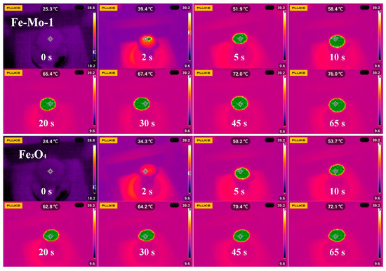 Infrared radiation images of Fe-Mo-1 (dried) and Fe3O4 (dried) at different times during the experiment.