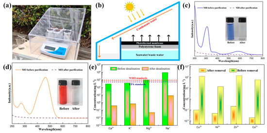 The laboratory used ICP-OES/MS (Agilent 5110, Santa Clara, CA, USA) to measure the concentration of Cu2+, Ni2+, Zn2+, Co2+ ions before and after sewage purification and the concentration of Na+, Mg2+, K+, Ca2+ ions before and after simulated seawater desalination. The sewage used in the experiment was simulated sewage (10 mg L−1 MB and 10 mg L−1 MO) prepared with organic dyes, and the seawater was prepared with sea salt according to the standard of 3.5 wt% mass fraction. The UV-Vis-NIR spectrophotometer (UV-3600, Shimadzu, Tokyo, Japan) was used to detect the light absorption performance of organic dyes and then judge the purification effect of the SSG device on organic dyes. The digital multimeter (V96C, Mechanic, Shenzhen, China) was used to measure resistance before and after simulated seawater desalination, and then judge whether the seawater desalination experiment achieved the expected effect.