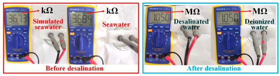 The quality of water can also be expressed using resistance values obtained from resistance tests performed at a constant distance with the multimeter electrode [43]. As shown in Figure 8, the resistances measured for the configured simulated seawater and the real seawater are 36.73 kΩ and 36.84 kΩ, respectively, indicating that the configured simulated seawater and the real seawater have similar ion concentrations. The simulated seawater and deionized water resistance after desalination were both measured to be 1.05 MΩ, which illustrated that seawater was effectively desalinated.
