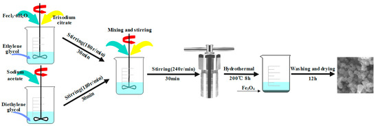 The Fe3O4 nanospheres were prepared by the hydrothermal method [44], and the preparation process is shown in Figure 9. First, FeCl3·6H2O (1.95 g, 7.2 mmol) and 0.1 g sodium citrate were added, respectively, to 40 mL of ethylene glycol solution and vigorously stirred with a magnetic stirrer (180 r/min) for approximately 30 min. Similarly, 4 g of sodium acetate was weighed and added to 40 mL of diethylene glycol, using a magnetic stirrer to stir vigorously (180 r/min) for about 30 min. Then the above two solutions were poured into the beaker and continued to be stirred with the magnetic stirrer (180 r/min) for about 30 min. After the fusion was uniform, the mixed solution was put in the reactor and reacted for 8 h at 200 °C. Finally, after the reactants were cooled to room temperature, the black precipitate was collected by the magnetic decantation method, rinsed 3 times with deionized water and anhydrous alcohol, and dried at 50 °C vacuum for 12 h, thus preparing nano Fe3O4.