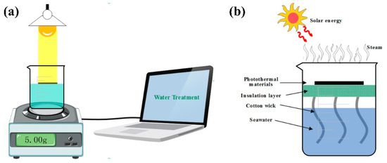 The schematic diagram of the SSG experiment platform is shown in Figure 10a. The laptop was connected to a balance with automatic measurement data recording, and the quality information collected was transmitted to the laptop in real time. A beaker was placed above the balance and the liquid in the beaker was sewage/seawater to be vaporized. The schematic diagram of the photothermal conversion device is shown in Figure 10b. The photothermal conversion layer was the sample prepared in this work. The sample was placed on polyethylene foam which was suspended in the middle of the beaker as a heat insulation layer. The main function of the heat insulation layer was to block the contact between sunlight and seawater, to block heat radiation and heat convection, so that sunlight was absorbed by the material as much as possible and converted into heat energy for water evaporation, which makes the experimental results more accurate. The transfer of water between seawater and the photothermal conversion material used a cotton wick, which ensured that the liquid in the beaker could be continuously transported to the photothermal conversion layer for evaporation [45]. The xenon lamp (CEL-HXF300-T3, CEAULIGHT, Beijing, China) was used to simulate sunlight and an electronic scale (JS-A5, CEAULIGHT, Suzhou, China) was used to measure the evaporation quality of seawater in real time; the scale was connected to the computer and fed the measured data back to the computer for real-time recording. The infrared radiation imager (PTi120, Fluke, Shanghai, China) was used to measure the temperature of the sample surface and take infrared photos. The optical power meter (CEL-FZ-A, CEAULIGHT, Beijing, China) was used to calibrate the light intensity of xenon light.
