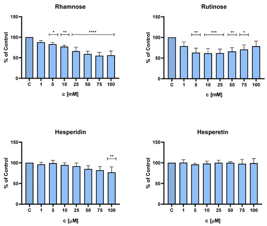 Effect of rhamnose, rutinose, hesperidin, and hesperetin on NHDFs viability. Untreated NHDFs cultured in a serum-free medium containing DMSO (0.1%; v/v) were used as a negative control (C). Results are expressed as a percentage of control viability and SD. Number of measurements: n = 4. * p < 0.05; ** p < 0.01; *** p < 0.001; **** p < 0.0001 were considered significant compared to control. (One-way ANOVA; Dunnett’s multiple comparisons tests were performed using GraphPad Prism).