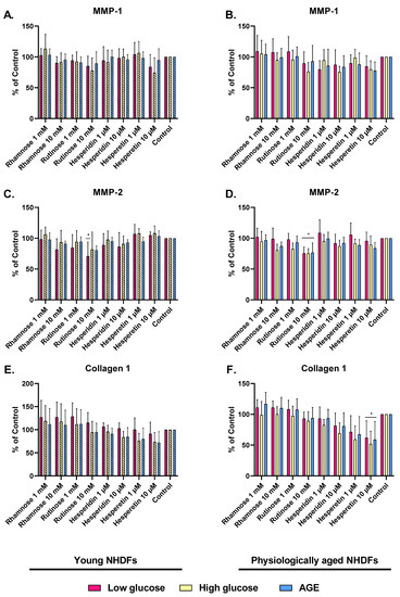 The effects of rhamnose, rutinose, hesperidin, and hesperetin on MMP-1, MMP-2, and collagen 1 production. MMP-1 (A), MMP-2 (C), and collagen 1 (E) production in young NHDFs, that were cultivated in low glucose medium or high glucose medium or medium supplemented with AGEs and the effects of rhamnose, rutinose, hesperidin, and hesperetin on MMP-1 (B), MMP-2 (D) and collagen 1 (F) production in physiologically aged NHDFs cultivated in low-glucose medium, high-glucose medium and medium supplemented with AGEs. Untreated NHDFs cultured in the respective media were used as controls. A number of measurements: n = 6. * p < 0.05 were considered significant compared to the control. (One-way ANOVA; Dunnett’s multiple comparisons tests were performed using GraphPad Prism).