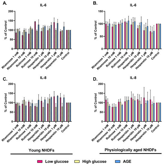 The effects of rhamnose, rutinose, hesperidin, and hesperetin on IL-6 (A,B) and IL-8 (C,D) production by young or physiologically aged NHDFs, that were cultivated in low-glucose medium, high-glucose medium, and medium supplemented with AGEs. Untreated NHDFs cultivated in these individual media were used as controls. A number of measurements: n = 6. (One-way ANOVA; Dunnett’s multiple comparisons tests were performed using GraphPad Prism).