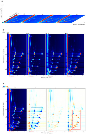 GC-IMS analysis of four different Cui Guan pears. (A) 3D-topographic; (B) 2D-topographic plots; (C) The difference comparison topographic plots.