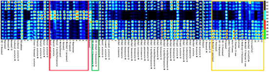 As shown in Figure 2, five volatile compounds where concentration was not a significant difference in all the Cuiguan pears were identified, including ethanol, ethyl-acetate (D and M), hexyl-acetate (D and M), butyl-acetate (M) and thiophene. A total of 28 compounds were an advantage in the ‘ZH’, including 15 esters, 4 alcohols, 4 ketones, 3 aldehydes, beta-pinene and dimethyl trisulfide. In particular, dimethyl trisulfide, 6-methyl-5-hepten-2-one, 3-hydroxy-2-butanone, 1-penten-3-one, beta-pinene, γ-terpinene, propanal, (e)-2-pentenal, (e)-2-heptenal, 1-pentanol and 3-methyl-1-pentanol were primarily contained in the ‘ZH’, which revealed low contents of other samples (labeled with yellow rectangles in Figure 2). (E)-ethyl-2-hexenoate were primarily contained in the ‘CM’ (labeled with green rectangles in Figure 2). As for the ‘SD’, 2-heptanone, 1-pentanol, 1-butanol, 3-methylbutanol, butyl 2-methylbutanoate, heptyl acetate and butyl acetate were identified as major volatile compounds. Five compounds were primarily contained in the ‘SC’, including (e)-2-Pentenal, heptanal, hexanal, isobutyl acetate and thiophene. The volatile compounds in the Cuiguan pears from different regions were basically similar. However, their signal intensities were significantly different.