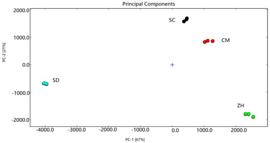 In Table 1 results of the physicochemical parameters are reported. The skin color of a pear is considered an important factor in quality and consumer acceptance [12]. The results showed that the skin colors of the four Cuiguan pears were strong statistical differences (p < 0.05). The ‘SD’ had the highest lightness in four samples. The hue angle and chroma showed differences among the pears. The ‘SD’ and ‘ZH’ are greener than the other pears according to the statistical analysis of hue angle. Chroma ‘C’ expression is analogous to color saturation or intensity [13]. The ‘SC’ and ‘ZH’ had the highest color saturation. Firmness, TSS and TA are important factors for the eating quality of a pear and correlates with consumer acceptance [14,15,16]. The ‘CM’ and ‘ZH’ had better performances than the other pears with TSS and TA. Vitamin C content differed considerably in the four pears. The ‘CM’ and ‘ZH’ had higher Vitamin C contents (6.88 mg/100 g and 5.80 mg/100 g). The total phenol (TP) contents of the four pears ranged from 1.20 mg/g to 2.83 mg/g of FW, with the highest value in the ‘SC’ and the lowest value in the ‘SD’. In the same way, the total flavonoid (TFA) content of the four pears ranged from 0.62 mg/g to 1.26 mg/g in Table 1, with the highest content in the ‘ZH’ and the lowest content in the ‘SD’. The TP and TFA of a pear may increase the antioxidative activity for humans in blood plasma [17].