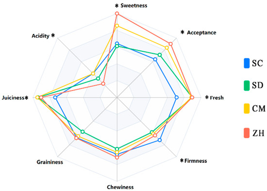 In Figure 4, the results showed that the sensory description of Cuiguan pears from different areas was significantly different (p < 0.05). The consumers expressed a positive acceptance for the ‘ZH’ and ‘CM’. It is important to note that there was no statistically significant difference in the acceptance of the ‘ZH’ and ‘CM’. The ‘ZH’ was characterized by the best sweetness, fresh and graininess intensity, followed by the ‘CM’, which exhibited a slight lower value. The main attributes that influence consumer preferences are taste and aroma; texture; shape; and visual appearance [30]. In each of the previous indicators, the ‘ZH’ had a good performance, which may be the reason for the highest consumer acceptance.
