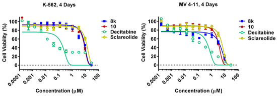 | Cmpd | K562 (IC50, μM) a | MV4-11 (IC50, μM) a | Cmpd | K562 (IC50, μM) a | MV4-11 (IC50, μM) a |