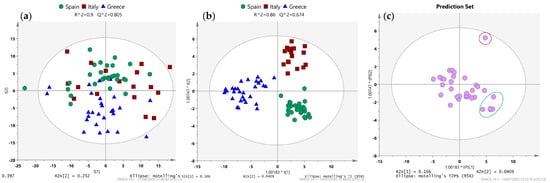 (a) PCA scores scatter plot of PC1 and PC2 with the European samples examining geographical origin; (b) OPLS-DA scores scatter plot depicting the separation between Spain, Italy, and Greece; (c) scores scatter plot of all blended samples as the prediction set. One sample appears to contain mainly Italian EVOOs, five mainly Spanish, and the rest lie among the three countries.