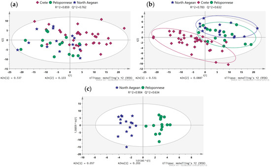 (a) Unsupervised PCA scores scatter plot of PC1 and PC2 with the Greek samples examining geographical origin; (b) respective supervised PLS-DA scores scatter plot; (c) OPLS-DA scores scatter plot with samples from the North Aegean vs. Peloponnese.