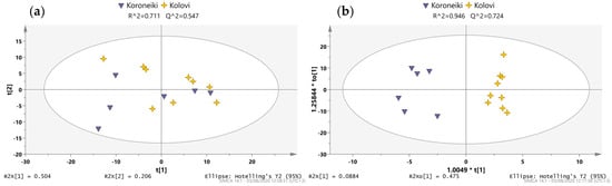 In the study of the variety parameter, only Koroneiki and Kolovi could be examined, as they were the only ones from which enough samples were collected to provide a statistically meaningful outcome. Furthermore, samples only from the North Aegean were examined to ensure that any variation in the samples was due to the different variety and not the region. These varieties were examined for the first time with 1H NMR metabolite profiling, as only two previous studies have implemented 31P NMR and LC-MS profiling [25,26]. The built PCA model formed by two principal components with R2X and Q2 at 0.711 and 0.547 respectively, revealed a reasonable trend among the two varieties (Figure 3a). In the OPLS-DA model, the two classes were separated clearly in the predictive component (x-axis) (Figure 3b), resulting in a model with great goodness of fit (0.946) and predictability (0.724). A two-way filtering process, as with samples from Europe, was applied for the extraction of a tentative biomarkers list. The final list contained features filtered based on their VIP and p(corr) values (Table S4).