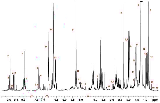 Annotated representative 1D 1H NMR spectrum of a Greek EVOO (600 MHz, chloroform-d, reference with IS at 0 ppm). 1: Acetoxypinoresinol; 2: monoaldehydic form of oleuropein aglycon (MFOA)-5S,8R,9S isomer; 3: MFOA-5S,8S,9S isomer; 4: monoaldehydic form of ligstroside aglycon (MFLA)-5S,8R,9S isomer; 5: MFLA-5S,8S,9S isomer; 6: oleacein; 7: oleocanthal; 8: all fatty acids; 9: unsaturated fatty acids; 10: sterols; 11: squalene; 12: triterpenes; 13: hydroxytyrosol and derivatives; 14: tyrosol and derivatives.