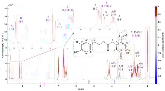 Furthermore, a typical challenge in such studies regardless of the type of sample e.g., EVOO, virgin olive oil (VOO), PDO, and/or the goal, e.g., geographical or botanical origin, is the annotation of any revealed biomarker [29]. Commonly, classification could be achieved to a certain degree; however, the identification of statistically significant features remains highly uncertain [30]. Different tools have been suggested depending on the analytical method using most of the times chemical and/or spectral databases, which are, however, incomplete, specific, or random, especially in food components or bioactives [31]. In NMR spectroscopy in particular, a tool that could aid in the identification procedure is statistical total correlation spectroscopy, or STOCSY, which was first introduced in the study of biological samples. It generates a pseudo-spectrum by correlating peaks with the same fluctuation across NMR spectra of the respective samples by calculating the correlation coefficient between a defined “driver” peak and all other signals in the spectrum [32].