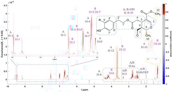 STOCSY 1D pseudo-NMR spectrum of MFOA-5S,8R,9S isomer (A) and MFLA-5S,8R,9S isomer (B). Correlation coefficients to the other signals in the median EVOO NMR spectrum are color-encoded: the “driver peak” was at 9.450 ppm. Zoom-in of the aldehydic and aromatic regions is also presented.