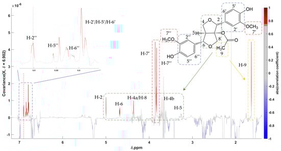 STOCSY 1D pseudo-NMR spectrum of acetoxypinoresinol. Correlation coefficients to the other signals in the median EVOO NMR spectrum are color-encoded: the “driver peak” was at 6.902 ppm. Zoom-in of the aromatic regions is also presented.