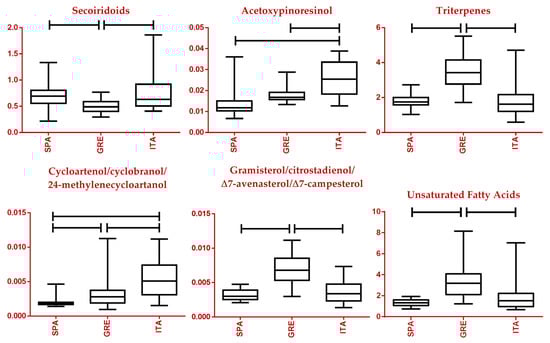 Box plots of a selection of statistically significant markers in the European sample set. Specifically, Secoiridoids, Acetoxypinoresinol, Terpenoids, Cycloartenol/Cyclobranol/24-methylenecycloartanol, Gramisterol/Citrostadienol/Δ7-Avenasterol/Δ7-Campesterol, and UFAs are depicted (vertical axis expressed in normalized intensity). Horizontal lines between classes indicate a p-value lower than 0.05. SPA: Spain, GRE: Greece, ITA: Italy.