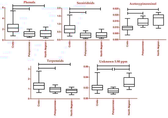 Box plots of a selection of statistically significant markers in the Greek sample set. Specifically, Phenols, Secoiridoids, Acetoxypinoresinol, Terpenoids, and an unknown tentative marker are depicted (vertical axis expressed in normalized intensity). Horizontal lines between classes indicate a p-value lower than 0.05.