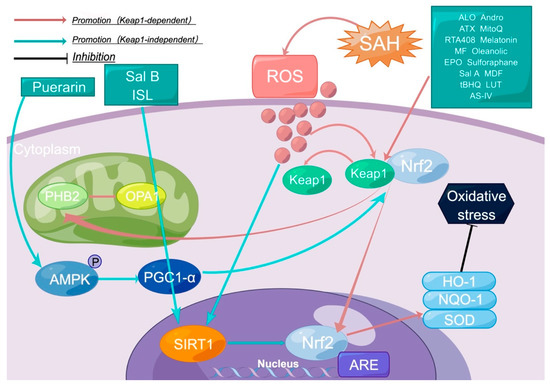 AMP-activated protein kinase (AMPK) is a major regulator of cellular energy metabolism and is involved in epigenetic modifications that control cell differentiation [64], which can be activated by bioactive compounds such as resveratrol and polyphenol-rich foods [65,66,67]. PGC-1α is a downstream molecule of AMPK that is primarily involved in mitochondrial biogenesis [68,69]. Recent studies have found that PGC-1α is associated with various inflammatory and metabolic diseases [70]. Phosphorylation of PGC1 α is an important index of AMPK signaling pathway activation, which is a bridge between the AMPK and Nrf2 signaling pathway [71]. PGC1α can activate transcription factors such as Nrf2 and reduce mitochondrial ROS production, thereby reducing oxidative stress injury [72]. Since mitochondria are the main source of ROS after aSAH, modulating the AMPK-PGC1α-Nrf2 pathway has great potential in the treatment of aSAH (Table 2).