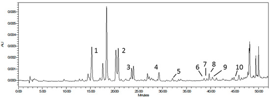 Chromatogram of black currant leaf extract with marked peaks of the identified compounds. The numbers 1–10 refer to the names of the compounds listed in Table 1.