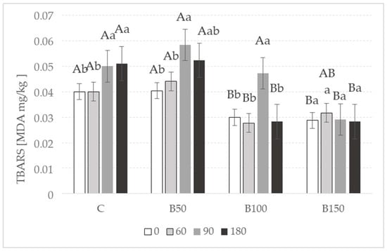 Amount of secondary lipid oxidation products (TBARS) in canned meat samples fortified with the extract of black currant leaves during 180 days of storage (4 °C). C—control; B50—black currant leaves 50 mg/kg; B100—black currant leaves 100 mg/kg; B150—black currant leaves 150 mg/kg. Means with different capital letters are significantly different (p < 0.05) on the day of the study. Means with different small letters are significantly different (p < 0.05) for a single variant during the storage time. Results are presented as mean ± SD.