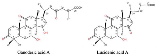 Ganoderma lucidum is a mushroom that has been used for many years as a medicinal and functional food in Far East countries to promote health and longevity. The most well-known properties of G. lucidum are its immunomodulatory and anti-cancer activities, which are attributed to its polysaccharides and triterpenoids [5]. Over 380 triterpenoids have been isolated from Ganoderma using phytochemical methods [6]. Among these triterpenoids, ganoderic acids are the most widely studied and reported. Ganoderic acids A and B were isolated from the fruiting bodies of G. lucidum for the first time in 1982 [7]. Ganoderic acids are C30 lanostane compounds (Figure 1). In addition to their anti-cancer and anti-diabetic effects, their anti-viral, hepatoprotective, antiplatelet, antioxidant, hypocholesterolemia, and antihistamine properties have also been reported.