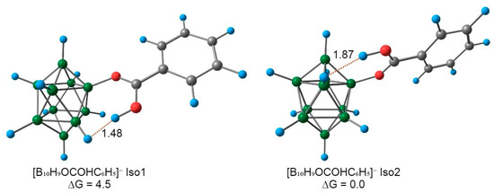 The structure of [B10H9OC(OH)C6H5]− was analyzed (Figure 5). Experimentally, the structure of this particle was established only by 11B–NMR spectroscopy data. Using theoretical modeling, the data on the structure of this derivative have been supplemented. The organic substituent can rotate freely, relative to the cluster fragment. The rotation barrier of the organic fragment was ~8 kJ/mol. The two lowest energy isomers were localized on the potential energy surface, and the difference in Gibbs energy between them was 3 kJ/mol. The structures of these isomers were stabilized with the formation of an intramolecular dihydrogen bond between the proton of the hydroxy group of the organic substituent and hydrogen from the boron cluster. The B-O bond length was equal to 1.50 Å. The bond length of the C = O bond was equal to 1.25 Å, which was longer than in the case of initial benzoic acid (1.20 Å), whereas the bond length of the C-O bond was equal to 1.29, which was shorter than that of benzoic acid (1.33 Å).