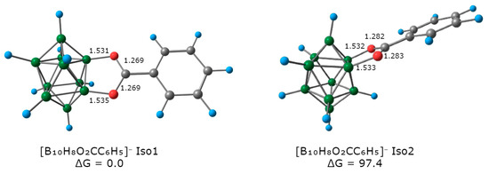 Finally, the process of intramolecular cyclisation occurred, and [B10H8O2CC6H5]− was formed (Figure 7). This anion had two isomers. The first isomer [2,6-B10H8O2CC6H5]− had substituted boron atoms in different equatorial belts, whereas the second isomer [2,3-B10H8O2CC6H5]− had two substituted boron atoms in one equatorial belt. The first isomer [2,6-B10H8O2CC6H5]− had significantly lower Gibbs energy than the second isomer [2,3-B10H8O2CC6H5]− (the difference between two isomers is equal to 97.4 kJ/mol). This fact is the reason of high regioselectivity for the formation process of the disubstituted carboxonium derivative. The main geometric parameters of [2,6-B10H8O2CC6H5]− were considered. The B-O bond lengths were equal to 1.535 Å. The C-O bond lengths were equal to 1.269 Å. Obtained parameters were similar to those previously obtained for the [2,6-B10H8O2CCH3]− anion.