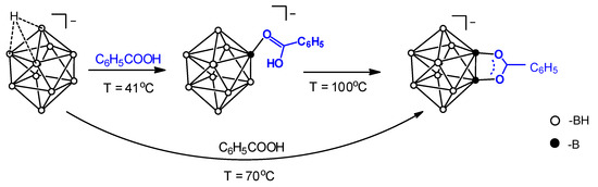 The process of obtaining [B10H8O2CC6H5]− can be performed in one stage, without the separation and purification of [B10H9OC(OH)C6H5]−. In this case, the reaction between [B10H11]− and C6H5COOH was carried out in an autoclave at 70 °C. Dichloromethane CH2Cl2 was also chosen as a solvent. The main advantage of a one-pot preparation of the target disubstituted product is the significant decrease in the total time required for the synthesis, compared with the two-stage approach. The overall yield of the target product is similar to the two-stage route.