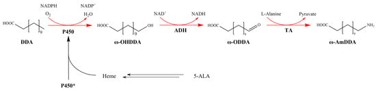 Biosynthetic pathway of ω-AmDDA. The double arrows indicate a multistep reaction. P450*, P450 without hydroxylation activity; DDA, dodecanoic acid; ω-OHDDA, 12-hydroxydodecanoic acid; ω-ODDA, ω-oxododecanoic acid; ω-AmDDA, ω-aminododecanoic acid; 5-ALA, 5-aminolevulinic acid.
