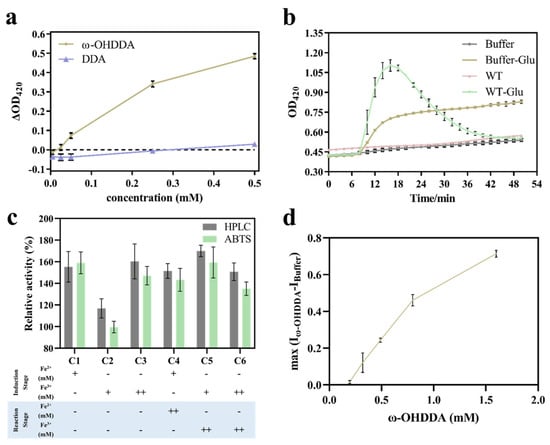Fortunately, GOaseM3-5 was much more sensitive to ω-OHDDA than D-glucose (Figure 3b). Using the absorbance of the buffer containing D-glucose as the background value, the result calculated by subtracting the background value from the absorbance value of the reaction product (I = max (Iω-OHDDA − IBuffer)) had a linear relationship with the concentration of ω-OHDDA in the range of 0.2–0.8 mM (Figure 3d). In this way, the false positive result caused by D-glucose in the system could be avoided. This modified HTS method was named ABTS 2.0 colorimetry.