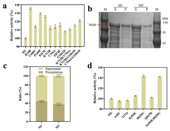 Combinatorial mutagenesis of hot spots identified in directed evolution. (a) With M1 as the parent, single-point mutants and combined mutants were constructed according to the results of the first round of screening, and each mutant contained the G307A mutation. The enzyme activity of M1 was set as 100%. (b) The expression of M1 and M2 (cyp153a-ncpG307A/R14R). Lane M, marker; lane S, supernatant; lane P, precipitation. (c) Expression analysis of P450 mutants. SDS-PAGE protein electrophoresis results were analyzed by ImageJ software to calculate the proportions of P450 in the supernatant and the precipitation of M1 and M2, respectively. (d) With M2 as the parent, single-point mutants and combined mutants were constructed according to the results of the second round of screening, and each mutant contained the G307A/R14R mutation. The enzyme activity of M2 was set as 100%.