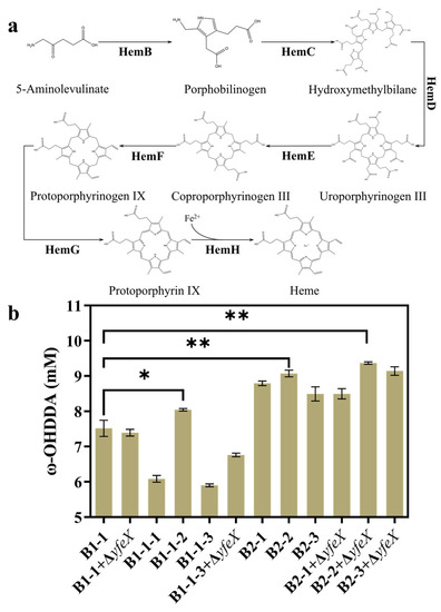 Enhancement of heme synthesis in E. coli. (a) Heme synthesis pathway of E. coli. (b) ω-OHDDA production in whole-cell systems modified with different strategies. B1-1 without the modification of heme synthesis was used as the control strain. Statistical analysis was performed by an unpaired two-tailed t-test. * 0.01 < p < 0.05; ** p < 0.01. B2-1, B2-2 and B2-3 used promoters with different strengths (Plac, Ptac and PT7, respectively) for hemB overexpression. The E-M1-3 plasmid was expressed in the control group and in each experimental group.