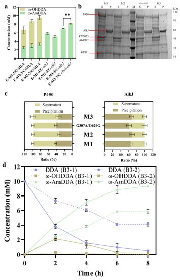 By replacing the chimeric P450 (M1) in the previously constructed E. coli strain P1-1 (E-M1-3/C-M2-2) [6] with the P450 mutants M2 (cyp153a-ncpG307A/R14R) and M3 (cyp153a-ncpG307A/R14R/D629G) obtained from directed evolution, the E. coli strains P1-1 (E-M2-3/C-M2-2) and P1-1 (E-M3-3/C-M2-2) were generated. As compared to the previous strain, the ω-AmDDA production was increased by 21.5% and 35.6%, respectively (Figure 7a). Meanwhile, the obvious accumulation of the intermediate ω-OHDDA was observed, suggesting that the conversion rather than the formation of ω-OHDDA became the rate-limiting step, which may be related to the massive consumption of NADPH by the enhanced P450 catalytic reaction, leading to the decreased pool of NAD+/NADP+ in the cells [40,41]. The alcohol dehydrogenase BsADH, responsible for further catalyzing ω-OHDDA to ω-ODDA, was NAD+-dependent [42], so the lower NAD(H) pool may limit the activity of this enzyme, thus leading to the accumulation of ω-OHDDA. For this reason, we replaced BsADH with the FAD-dependent alcohol dehydrogenase (AlkJ) [5,43] from Pseudomonas oleovorans, thus avoiding the accumulation of the intermediate and further improving the output of ω-AmDDA (Figure 7a). However, we found that the introduction of the P450 mutant had a negative impact on the expression of AlkJ (Figure 7b,c), which might be related to the increase in the metabolic burden caused by the improved P450 expression. Such phenomenon was also observed in other studies on multi-enzyme cascade biotransformation in E. coli [6,44]. In order to restore the expression level of AlkJ, a stronger RBS2 (TCAATAGCCTTGACTAAGGAGGTAACT), as predicted by the RBS calculator [30,31] [https://salislab.net/software/ (accessed on 17 August 2022)], was introduced in front of AlkJ (C-rbs2-alkJ), which solved the expression problem of AlkJ and increased the output of ω-AmDDA to 7.98 ± 0.19 mM (Figure 7a).