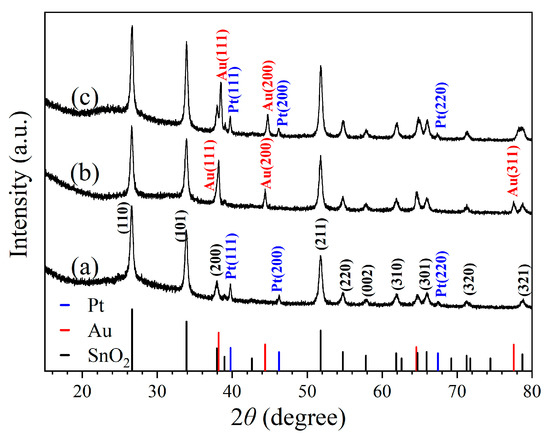 X-ray diffraction patterns taken for samples of (a) 1 wt% Pt–SnO2, (b) 5 wt% Au–SnO2, and (c) 1 wt% Pt–5 wt% Au–SnO2, after being sintered at 950 °C for 2 h in the air.