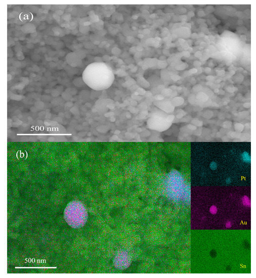 As pointed out in some previous papers, the SnO2 nanoparticles used in this study exhibit a very unique sintering behavior, and pellets prepared from them showed no sintering shrinkage, even after being sintered at 1200 °C [29]. Accordingly, all the samples prepared in this study showed no noticeable sintering shrinkage either. Figure 2a shows an SEM micrograph obtained for a fractured surface of a sample of 1 wt% Pt–5 wt% Au–SnO2 nanoceramics sintered at 950 °C for 2 h in the air. Firstly, some nanopores can be clearly observed in the micrograph, which should be helpful for gas sensing. It can be observed that most grains are about 70 nm in diameter, while a few much larger grains, around 300 nm in diameter, can also be observed. According to the EDS analysis shown in Figure 2b, those smaller grains should be SnO2 nanograins, and they must have experienced no obvious grain growth in the sintering, as they were quite similar to SnO2 nanoparticles in size. The much larger grains were Pt and Au grains, respectively. The Au powder and Pt powder were marked as <500 nm and <1 μm, respectively. Thus, these large grains must have come from their starting materials. According to two very recent papers, large Pt grains are important for room-temperature CO-sensitive and H2-sensitive Pt–SnO2 composite nanoceramics to achieve a high, long-term stability [37,38]. As a matter of fact, these two commercial Au and Pt powders, with relatively large particles, had been intentionally chosen as starting materials in this study.
