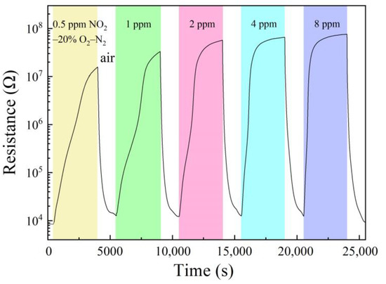 A commercial gas-sensing measurement system (GRMS-215, Partulab Com., Wuhan, China), which has been described in detail in previous papers [31,45], was used for the tests, mainly composed of a 350 mL quartz-sealed chamber and a computer for recording data. The sealed chamber contained four inlet tubes and one exhaust tube. Four inlet tubes were connected to N2 (99.999%, Zhongxinruiyuan Gas, Wuhan, China), O2 (99.999%, Zhongxinruiyuan Gas, Wuhan, China), 15 ppm NO2–N2 (97.0%, Foshan Kodi Gas, Foshan, China), and the air, to realize designated internal atmospheres. A flow controller was used to control the gas inflow in every pipe and ensure a stable gas flow. During the response stage, NO2, N2, and O2 entered the chamber at specific rates through three tubes, and the total rate was maintained at 300 mL/min. During the recovery stage, ambient air was pumped into the chamber at a rate of 10 L/min. During most measurements, the room temperature was kept at 25 °C and the RH in the air remained around 50%.