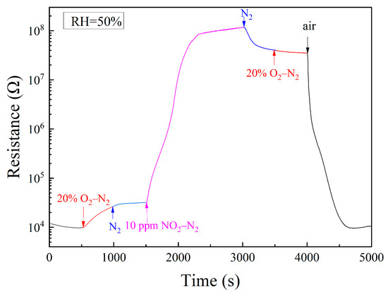 As an oxidizing gas, NO2 increases the resistance of n-type semiconductors through its chemisorption, which is the same as what oxygen does. It is meaningful to identify the influence of NO2 from that of oxygen in NO2 sensing. For this purpose, we had exposed a sample of 1 wt% Pt–5 wt% Au–SnO2 to a series of specifically designated atmospheres at room temperature, as shown in Figure 5. When the atmosphere was first changed from air to 20% O2–N2, the resistance slowly increased with time, which actually indicates a drying effect of the flowing gas of 20% O2–N2 in the sample. Those oxygen molecules chemisorbed on SnO2 must be very stable, so there was no turning point when the atmosphere was changed from 20% O2–N2 to N2. Upon being exposed to 10 ppm NO2–N2, a steep increase was observed when the atmosphere was changed from N2 to 10 ppm NO2–N2. The resistance was finally increased by more than three orders of magnitude, which demonstrates a strong chemisorption of NO2 on SnO2. When the surrounding atmosphere was changed from 10 ppm NO2–N2 to N2, the resistance only decreased very slowly with time, which further confirms a strong chemisorption of NO2 on SnO2. No turning point appeared when the atmosphere was changed from N2 to 20% O2–N2. It is worth mentioning that when the atmosphere was changed from 20% O2–N2 to N2 and from N2 to 20% O2–N2, respectively, only the oxygen content was changed. The absence of the turning point for oxygen content change in the resistance versus the time curve indicates a stable oxygen chemisorption on SnO2. Considering that both NO2 and O2 are strongly chemisorbed on SnO2 at room temperature, it was highly surprising to see that the resistance was sharply decreased when the surrounding atmosphere was changed from 20% O2–N2 to the air of 50% RH, as shown in Figure 5. Given the difference between these two atmospheres, water molecules in the air had obviously played the vital role in this resistance decrease.