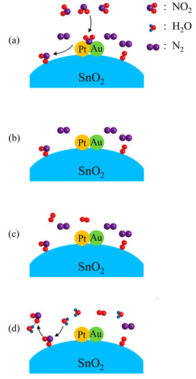 in which Pt–Au must have acted as the catalyst for the reaction, as shown in Figure 6a. As an oxidizing gas, NO2 molecules accept electrons from SnO2 when they are chemisorbed on SnO2. This explains the steep increase in resistance when the sample is exposed to 10 ppm NO2–N2. When the surrounding atmosphere is changed from 10 ppm NO2–N2 to N2, the chemisorption of NO2 is so stable that most NO2 molecules will not leave SnO2 in the surrounding N2, as shown in Figure 6b. In this way, only a slight decrease in resistance can be observed. When the surrounding atmosphere is changed from N2 to 20% O2–N2, no more O2 molecules can be chemisorbed on SnO2, as those O2 molecules chemisorbed on SnO2 earlier have remained there, as shown in Figure 6c. Thus, no resistance change can be observed for this atmosphere change. H2O and NO2 molecules are able to form NO2–H2O clusters through the hydrogen bonds between them [44]. When the ambient atmosphere is changed from 20% O2–N2 to the air of 50% relative humidity, NO2 molecules are desorbed from SnO2 by the attraction of H2O molecules, as shown in Figure 6d. This desorption of NO2 can be expressed as: