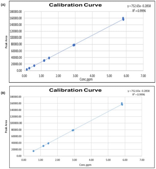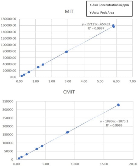 Figure 3 depicts the calibration curves of MIT and CMIT in samples, with unknown concentrations determined from the slopes. The curves had an R-squared value of 0.9996, indicating that reliable calculations of the samples MIT and CMIT content.