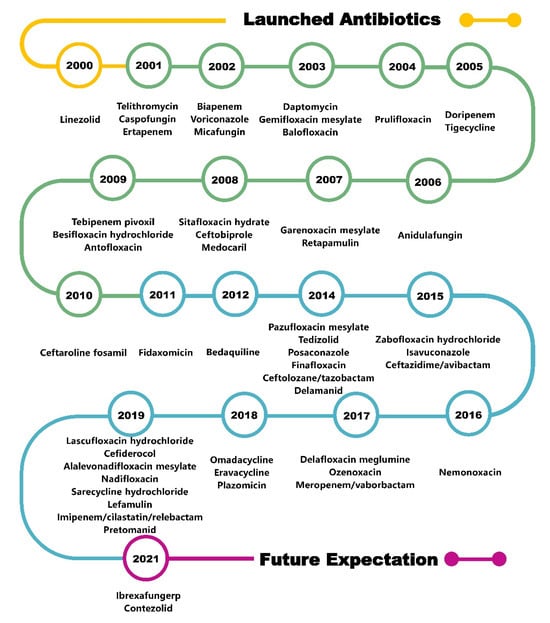 Although antibiotic resistance continues to increase, many exciting new chemical entities have been developed as antimicrobial agents, and antibiotics can be classified into categories based on their mechanism of action: inhibition of bacterial nucleic acid replication and transcription, interference with bacterial protein synthesis, prevention of bacterial cell wall synthesis, and enhancement of bacterial cell membrane permeability [5]. It is hoped that an in-depth exploration of the relationship between the chemical structure, mechanism, and antibacterial activity of antibiotics that were marketed from 2000 to 2021 (Figure 1) will provide insights for the design and development of next-generation antibiotics.