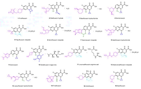 Balofloxacin (16) has excellent antibacterial activity against both GNB and GPB [50]. Structurally, methoxy at C-8 of balofloxacin could reduce phototoxicity [51]; moreover, the low migration rate of balofloxacin into cerebrospinal fluid guarantees central nervous system safety.