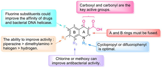 Long-term studies have established the SARs of quinolones (Figure 3). Fluoroquinolones, which have a fluorine atom at C-6, have attracted much attention due to their potent, broad-spectrum activity, ease of synthesis, and excellent oral bioavailability potential. Specifically, the A ring of pyruvic acid is a necessary group; replacing the carboxyl group at C-3 by acidic groups (such as sulfhydryl and acetic acid) and the carbonyl group at C-4 by a thioketone group or alanyl can reduce the antibacterial activity. In addition, the antibacterial and anticancer activity of the 3-carboxylic acid scaffold can be transformed through modifications. The C-3-modified derivatives containing the N-(5-(benzylthio)-1,3,4-thiadiazol-2-yl)-carboxamide moiety are good examples of new anticancer drugs [8]. Ring B can be slightly changed compared with ring A; replacing the 1-N substituent with vinyl, fluoroethyl, cyclopropyl, or difluorophenyl can enhance the activity, and similar results can be obtained through the substitution of N by ethyl or benzene [9]. If the substituent is at C-2, steric hindrance interferes with the binding of drugs to receptors and decreases or eliminates the activity. The C-5 substituents have both potential and steric effects on the antibacterial activity from both potential and stereo factors, and better antibacterial impact may be obtained with an amino substituent. The fluorine atom boosts penetration into bacterial cells and improves the antibacterial activity to 30 times higher than that of quinolones. Furthermore, the 5-fluoroisatin moiety improves the lipophilicity of drugs while increasing the antimycobacterial activity [10]. Substituents at C-7 can directly interact with DNA helicase or topoisomerase IV, and nitrogen-containing five- or six-atom alkaline heterocycles, such as piperazine, exhibit good activity. The activity could be improved by introducing chlorine or methoxy groups in C-8 [11].