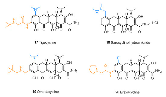 Tigecycline (17) is also called 9-t-butylglycylamido-minocycline (Figure 5). As the first commercialized glycylcycline antibiotic, tigecycline exerts a strong, extended-spectrum antibacterial effect due to the glycine phthalamide embedded into the minocycline skeleton [56]. This remodeling strategy also allows tigecycline to overcome the major molecular mechanisms of tetracycline resistance. Tigecycline is not affected by any efflux through tetracycline-specific efflux pumps or by the ribosomal protection mechanism of tetracycline resistance [57]. Therefore, tigecycline is an effective alternative that can address the challenges of MDR pathogens. However, due to insufficient gastrointestinal absorption, tigecycline requires intravenous administration and does not readily cross the blood–brain barrier (BBB).