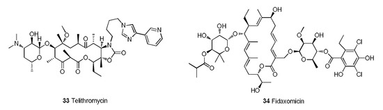 Telithromycin (33) is the first MA of the ketolide family that was approved for marketing [106]. In terms of its structure, the keto carbonyl at C-3 can reduce the drug resistance rate, and the cyclic carbamate that forms at C-11 and C-12 can increase the affinity for bacterial ribosomes (Figure 10) [107]. Telithromycin can exist stably under acidic conditions and has good activity against penicillin-resistant and macrolide-resistant strains. Moreover, the binding capacity of telithromycin to the ribosomes of wild-type strains is 10 times that of erythromycin and 6 times that of clarithromycin. In terms of PK, telithromycin has a bioavailability of approximately 57% and a half-life of 10 h and can be metabolized by CYP3A4 in the liver. Regrettably, telithromycin potentially causes cardiovascular risk and hepatotoxicity, which limits its potential [108].
