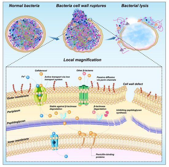Cefiderocol (41) is a novel parenteral siderophore cephalosporin that was discovered and developed by Shionogi Inc., Japan [127]. This drug is unique due to its siderophore-like property [128]. The side chain at C-3 of cefiderocol promotes the formation of a chelating complex with ferric iron to promote iron carrier-like transport through the outer membrane of GNB using an iron transport system. Cefiderocol is delivered to the periplasmic space through the outer membrane and released in the periplasmic space, where it binds to PBPs, mainly PBP3, and this binding inhibits peptidoglycan synthesis and leads to cell death (Figure 13). In addition, the entry of iron carriers into the periplasmic space of bacteria enhances the protection of bacterial β-lactamase stability [129].